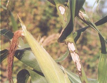癥狀 紋枯?。ㄋ追Q"花腳稈","爛稈瘟")是近年來發(fā)生危害日益嚴(yán)重的一種新病害。四川省各地均有發(fā)生,以高溫、高濕條件下和夏播玉米發(fā)病較嚴(yán)重。其寄主甚廣,除危害玉米外,還可侵染水稻、小麥、大麥、高粱、棉花、大豆等多種作物。該病主要危害葉鞘,也可侵染葉片、苞葉和果穗,玉米拔節(jié)至成熟期均可發(fā)病。開始從莖基部的葉鞘感病,后侵染葉片并向植株上部蔓延。發(fā)病初期,光出現(xiàn)水漬狀灰綠色圓形或橢圓形病斑,后轉(zhuǎn)為白色至淡 黃色,發(fā)病后期,變?yōu)榧t褐色云紋狀斑 塊。當(dāng)濕度較大時(shí),病斑上常長(zhǎng)出許多白霉(菌絲和擔(dān)孢子);當(dāng)溫度較高或植株已老健不適合病菌擴(kuò)大危害時(shí),即產(chǎn)生菌核,多藏于葉鞘內(nèi)。菌核初為白色,老熟時(shí)呈褐色。葉鞘受害后,葉片萎蔫,嚴(yán)重時(shí)整株枯死,果穗受害后,可使苞葉干枯,果穗腐爛。